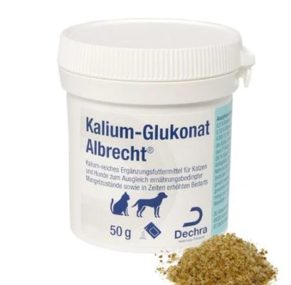 Das Kalium Glukonat der Marke Albrecht, ist ein Ergänzungsfuttermittel mit erhöhtem Kaliumgehalt für Katzen und Hunde zum Ausgleich ernährungsbedingter Mangelzustände oder in Zeiten, in denen ein erhöhter Bedarf erfolderlich ist (nur nach Verordnung durch den Tierarzt).