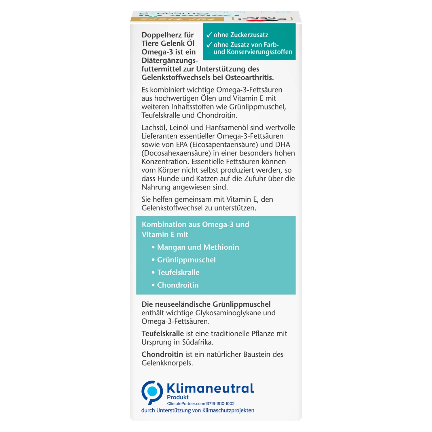 Doppelherz für Tiere Gelenk Öl ist ein Diätergänzungsfuttermittel zur Unterstützung des Gelenkstoffwechsels bei Osteoarthritis. Die hochwertige Ölmischung enthält wertvolle Feststoffe, ohne Zusatz von Zucker, Farb- und Konservierungsstoffen.