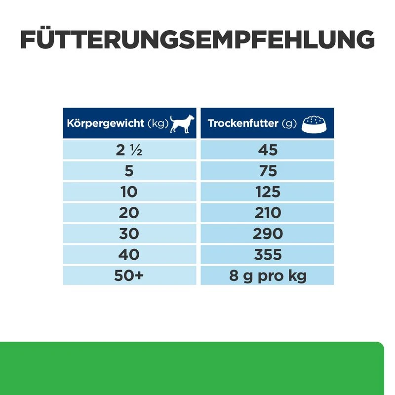Diese Angaben sind lediglich Richtwerte, weil die Bedürfnisse der Hunde variieren und die Futtermenge sollte angeglichen werden, um das optimale Körpergewicht Ihres Hundes zu erhalten.