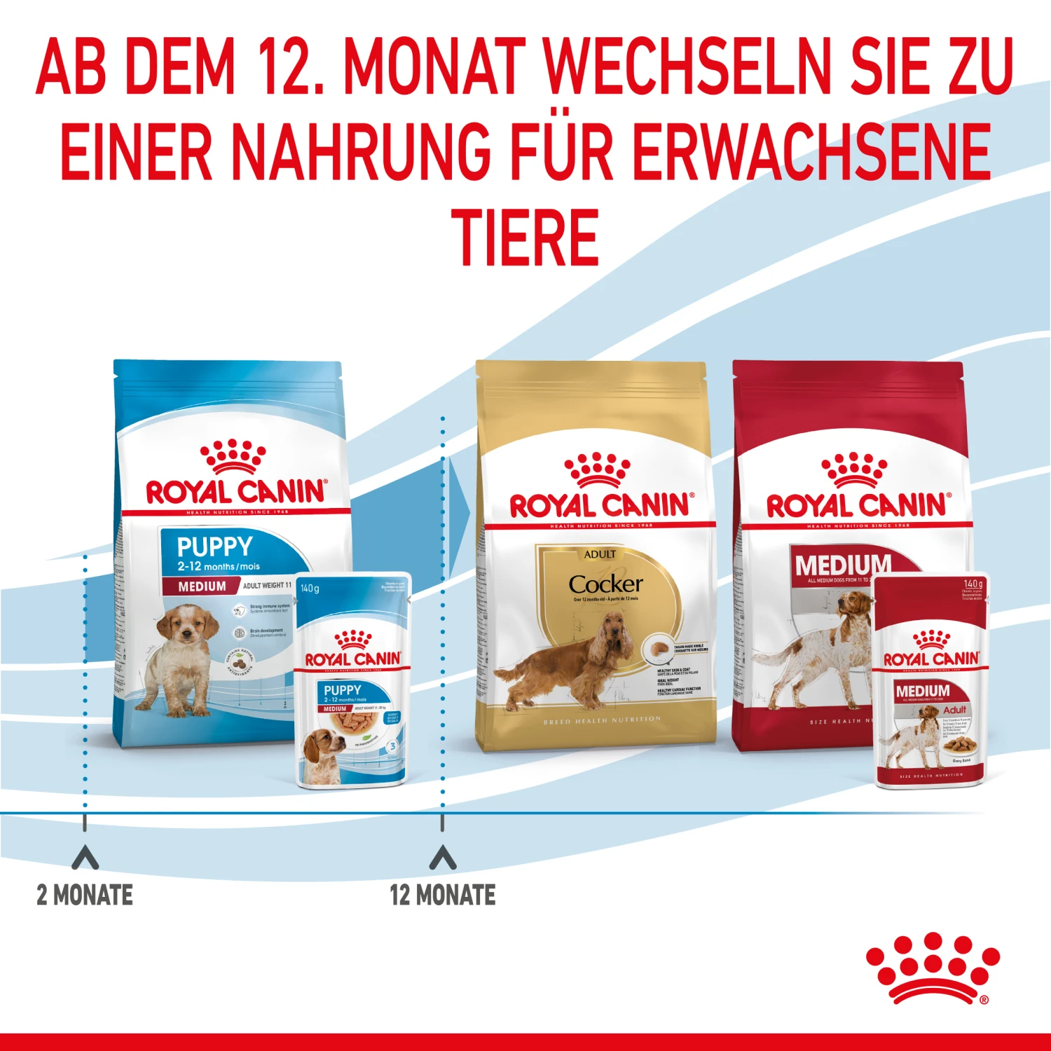Das Wachstum ist eine Schlüsselphase im Leben Ihres Welpen – es ist die Zeit von Veränderungen und Entdeckungen, die körpereigenen Abwehrkräfte Ihres Welpen entwickeln sich noch. Daher ist ein ausgewogenes Alleinfuttermittel für eine optimale Gesundheit notwendig. ROYAL CANIN Medium Puppy Welpenfutter in Soße ist für Welpen bis zum 12. Monat mit einem Endgewicht zwischen 11-25 kg geeignet und wurde speziell auf die Bedürfnisse von mittelgroßen Welpen abgestimmt. Die Entwöhnung junger Hunde von der Muttermilch kann schwierig sein – insbesondere dann, wenn das Futter nicht speziell auf die Bedürfnisse eines Welpen zugeschnitten ist. Aus diesem Grund hat ROYAL CANIN Medium Puppy in Soße eine für die Milchzähne von heranwachsenden Welpen mittelgroßer Rassen angepasste Stückchengröße und Textur. Es wird die Entwicklung der körpereigenen Abwehrkräfte von Hundewelpen durch einen Nährstoffkomplex mit Vitamin E und C wissenschaftlich nachgewiesen unterstützt. Außerdem ist ROYAL CANIN Medium Puppy in Soße mit einer Omega-3-Fettsäure (DHA) angereichert, die wissenschaftlich nachgewiesen die Gehirnentwicklung von Welpen unterstützt und den Lernprozess beim frühen Welpentraining fördern kann.