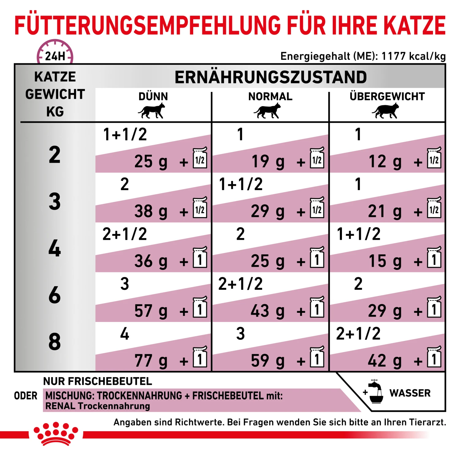 Bei diesem Produkt handelt es sich um eine tierärztliche Nahrung aus dem Sortiment Veterinary Health Nutrition von ROYAL CANIN®. Dementsprechend ist es wichtig, dass das Futter nur auf Empfehlung einer Tierärztin oder eines Tierarztes gefüttert wird. So kann sichergestellt werden, dass Ihr Tier genau die Nahrung erhält, die es wirklich benötigt. Eine Nahrungsumstellung sollte sorgfältig und schrittweise über einen Zeitraum von 7–10 Tagen erfolgen. Achten Sie auf die korrekte Portionsgröße – insbesondere bei Mischfütterung.