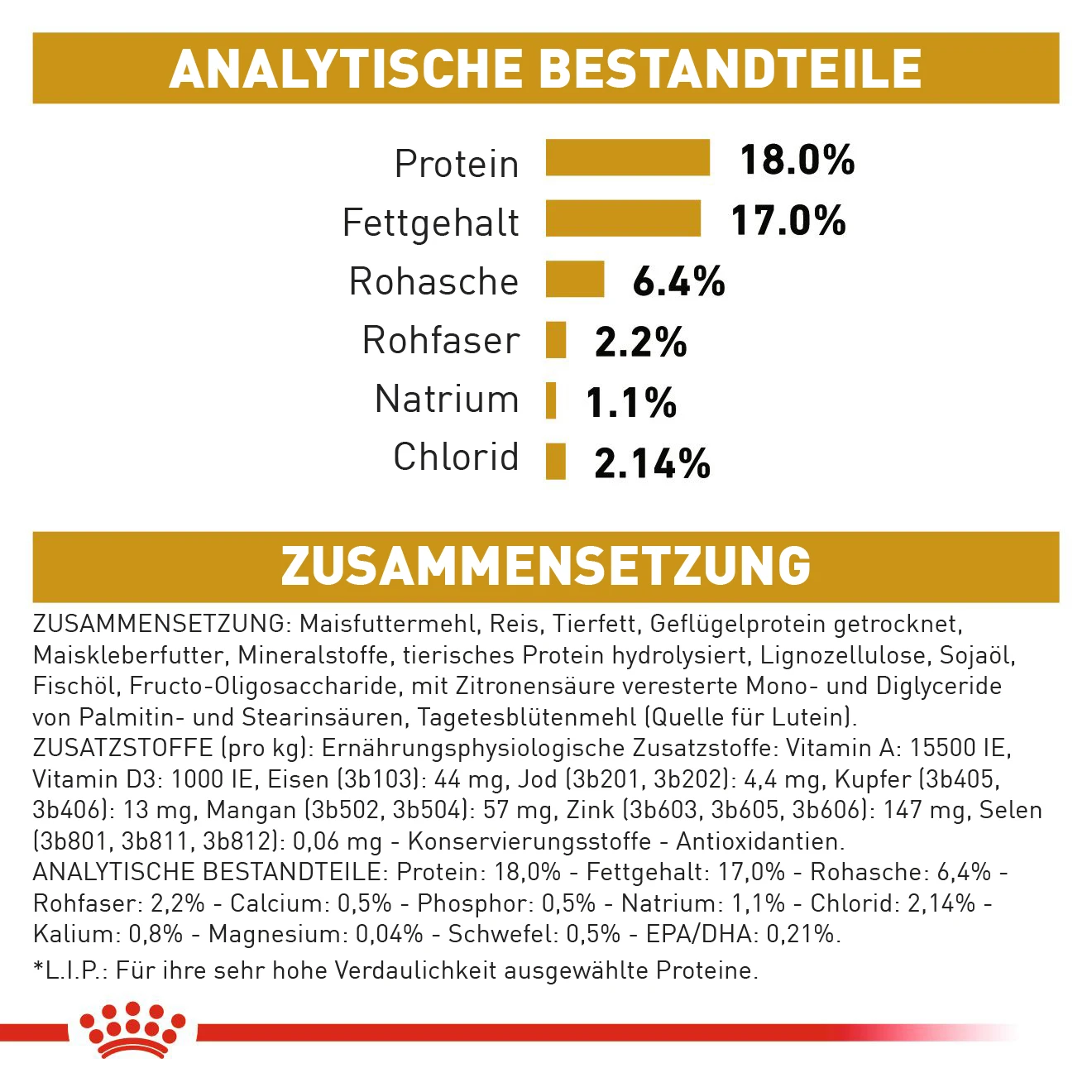 Bei diesem Produkt handelt es sich um eine tierärztliche Nahrung aus dem Sortiment Veterinary Health Nutrition von ROYAL CANIN. Dementsprechend ist es wichtig, dass das Futter nur auf Empfehlung einer Tierärztin oder eines Tierarztes gefüttert wird. So kann sichergestellt werden, dass Ihr Tier genau die Nahrung erhält, die es wirklich benötigt. Eine Nahrungsumstellung sollte sorgfältig und schrittweise über einen Zeitraum von 7–10 Tagen erfolgen. Achten Sie auf die korrekte Portionengröße – insbesondere bei Mischfütterung.