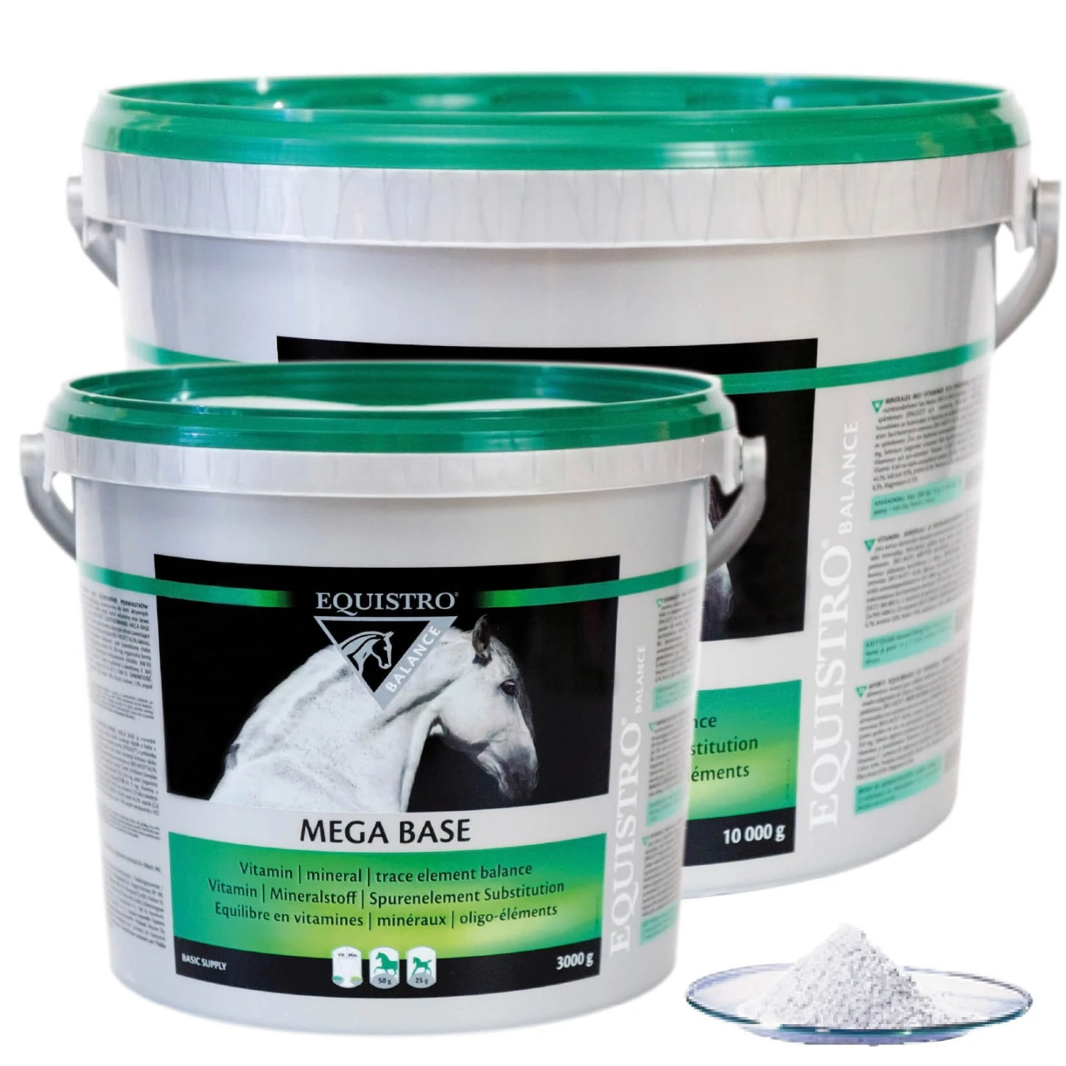 EQUISTRO MEGA BASE ist ein biologisch hochwertiges Mineralstoffkonzentrat mit Zusätzen an Aminosäuren, Spurenelementen und Vitaminen. Es hat ein Ca : P-Verhältnis von 5 : 1 und gleicht damit auch mögliche Mängel im Grundfutter ernährungsphysiologisch aus. Fohlen, Jährlinge, Zweijährige: Für einen optimalen Aufbau des Knochenapparates und verbesserte Gesamtentwicklung sowie Vorbeugung und Ausgleich von Mangelerscheinungen an der Knorpelsubstanz der Gelenke und Wirbelsäule. Deckhengste und Zuchtstuten: EQUISTRO MEGA BASE wird dem erhöhten Bedarf sowohl von tragenden und laktierenden Stuten als auch Hengsten während der Deckperiode gerecht. Sportpferde: Zur Bedarfsdeckung bei hoher Belastung wie intensives Training, Wettkampf u.s.w. Alle Nährstoffe liegen in einer biologisch hochwertigen resorptionsfähigen Formulierung vor (D.A.R.: Direct Animal Response).